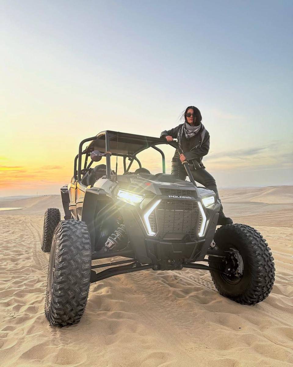 Tak sekadar berkunjung, Fitri Carlina melakukan kegiatan seru di gurun pasir tersebut, yakni berkendara off-road. Fitri Carlina pun terlihat gagah saat berpose di mobil off-road yang ia naiki. Yuk intip!