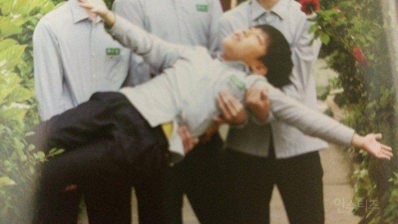 Namanya juga anak kecil, pas dia masih SD mungkin ya si Woojin pernah melakukan hal konyol bersama teman-teman. Nampak dalam foto ini, ia dilempar ke sungai oleh teman-temannya. Pasrah banget sih Woojin!
