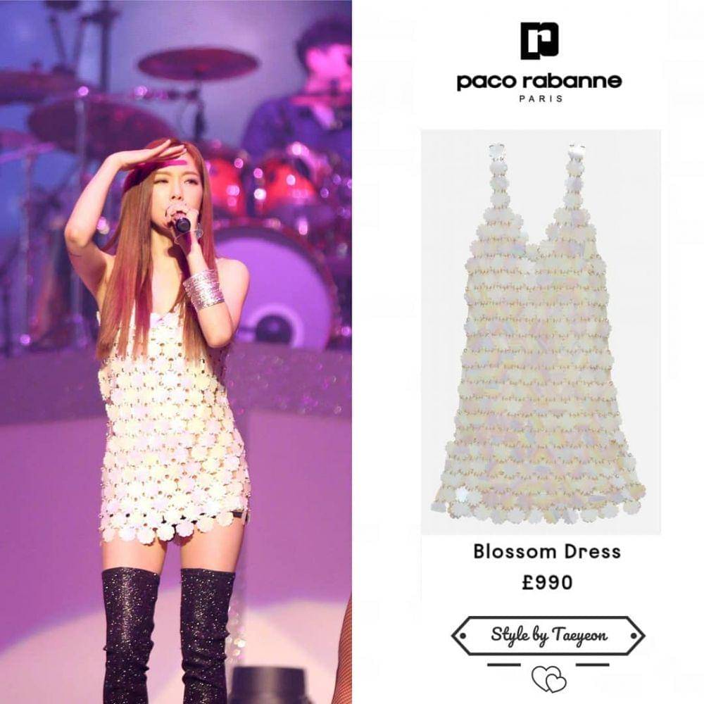 2. Tampak seksi dan mempesona saat berada di atas panggung, Taeyeon terlihat mengenakan blossom dress milik Paco Rabbane yang dibandrol dengan harga Rp18,13 juta