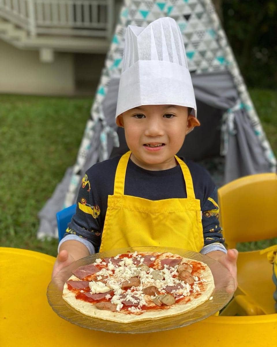 5. Sudah selesai membuat pizza, anak pertama Nycta Gina dan Kinos ini menunjukkan hasil karyanya. Lezat, nih!