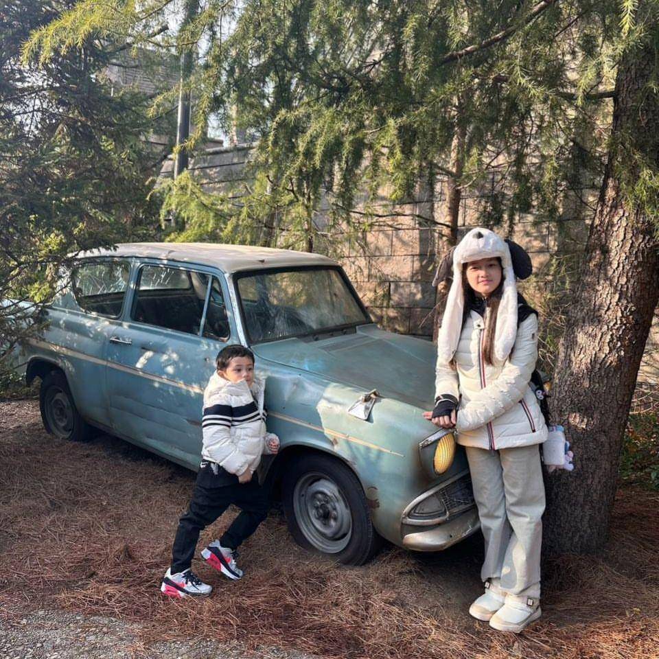 8. Elea dan Saka berpose di depan mobil Ford Anglia milik ayahnya Ron di film Harry Potter and the Chamber of Secrets (2002)