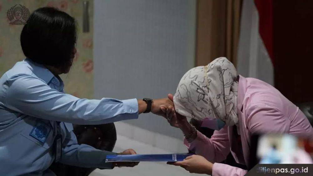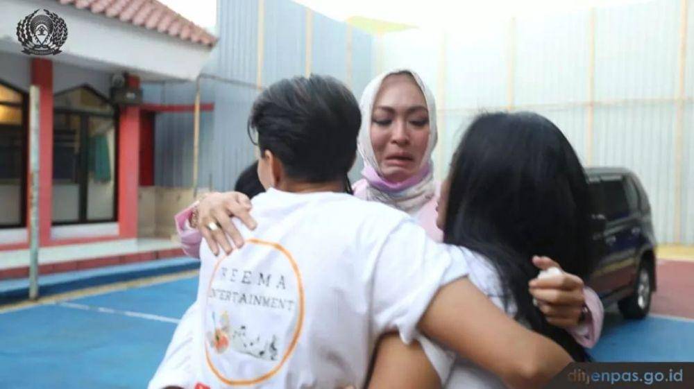 4. Angelina tak kuasa menahan tangisnya kala harus berpisah dengan petugas Lapas Perempuan Pondok Bambu
