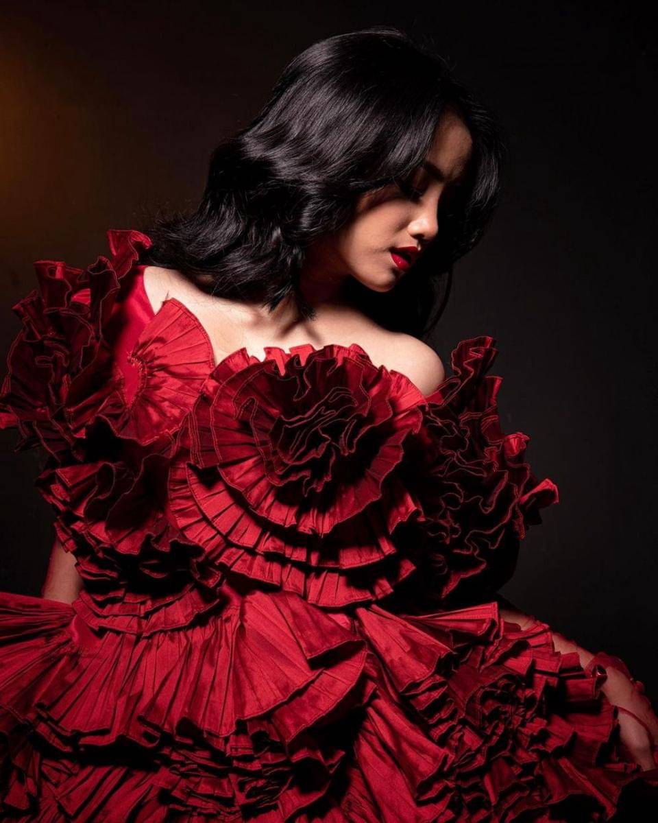 10 Pemotretan Terbaru Fuji dalam Balutan Gaun Merah, Auranya Membara!