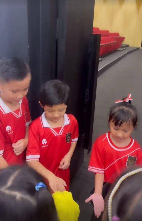 3. Dalam momen ini, Arsya tampak antusias memakai jersey Timnas Indonesia