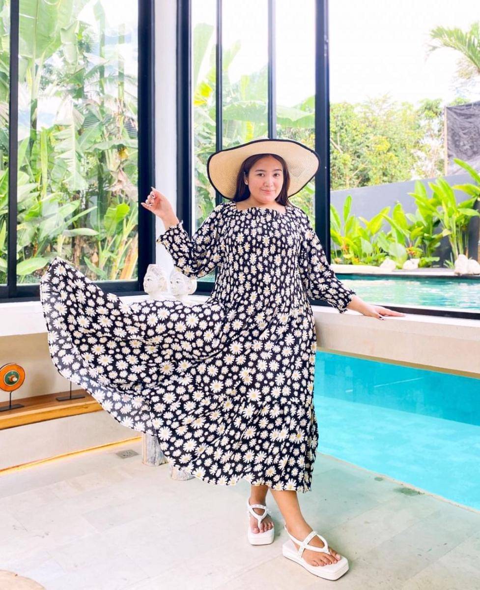 1. Dress floral yang dipadukan dengan floppy hats cocok banget untuk gaya ala tropis, sandal platform berwarna putih bisa menjadi aksen untuk tampil lebih santai