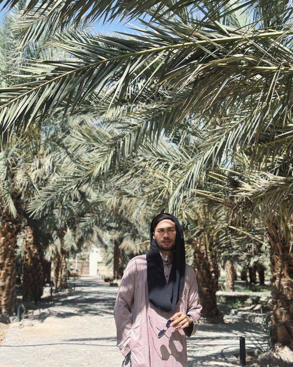 3. Gaya tetap cool, pria blasteran Arab dan Belanda ini berpose bak model papan atas saat berwisata di kebun kurma Madinah