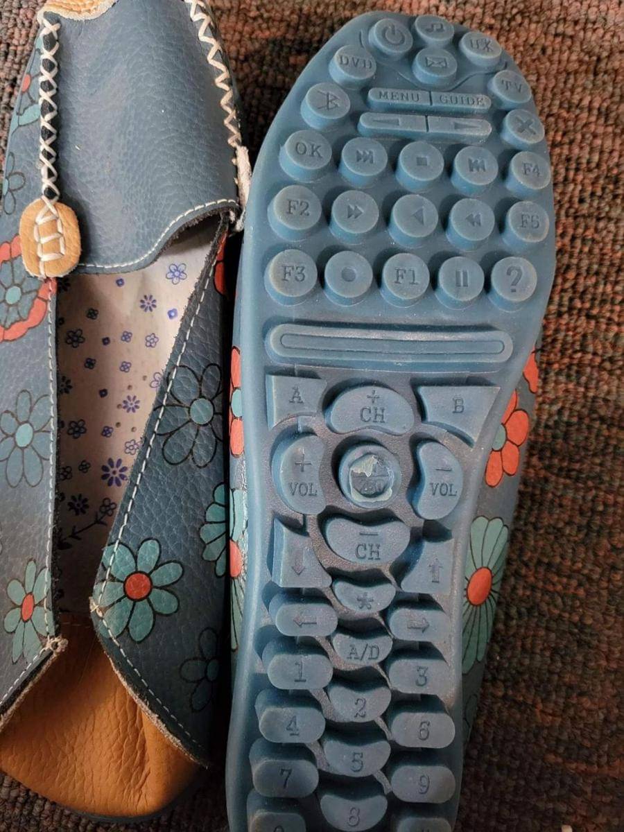 9. Kapan lagi punya alas sepatu dengan desain remot? Serasa lagi injek-injek remot TV, bah!