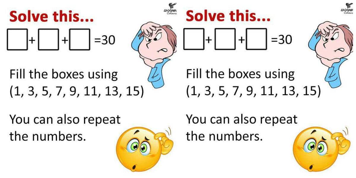 Isilah titik-titik di atas menggunakan (1, 3, 5, 7, 9, 11, 13, 15). Harap diingat, kamu boleh kok mengulang angka-angkanya.
