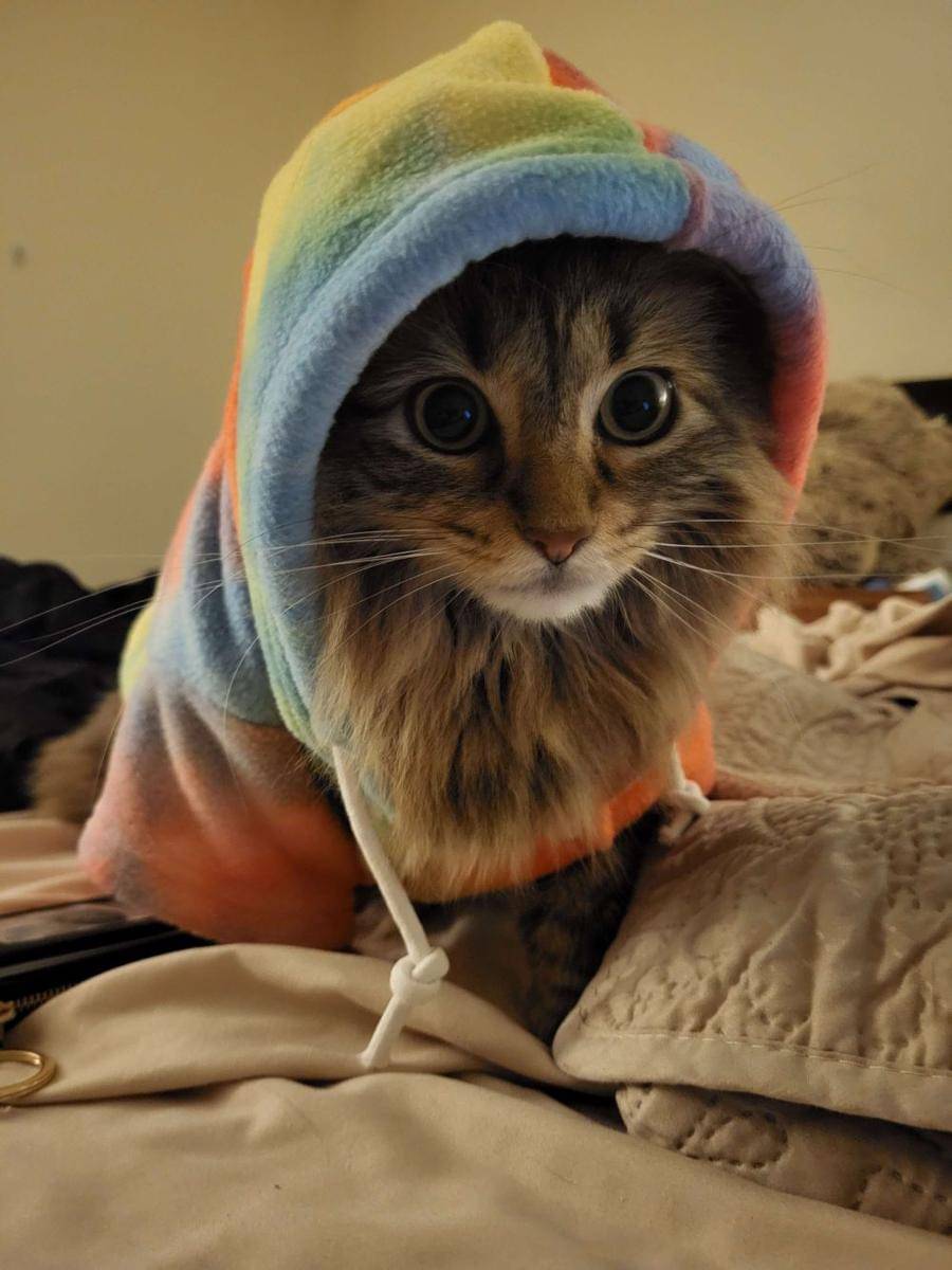 10. Dari tadi ngakak banget ngelihat kucing ini pakai hoodie. Capek!