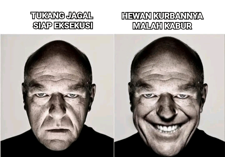 Berikut ini meme tukang jagal yang sering diikutsertakan dalam proses penyembelihan hewan kurban. Urusan hewan kabur juga bisa ditangani serius sama Kang Jagal.