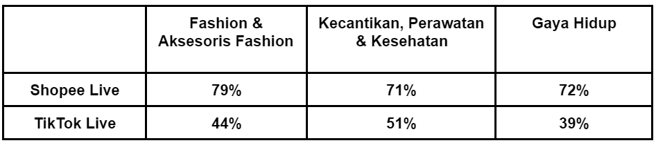 Pada ketiga kategori tersebut, Shopee Live unggul jauh melampaui para pesaingnya, termasuk pemain baru yaitu TikTok Live. Dimana persebaran persentase terlihat pada tabel di bawah;