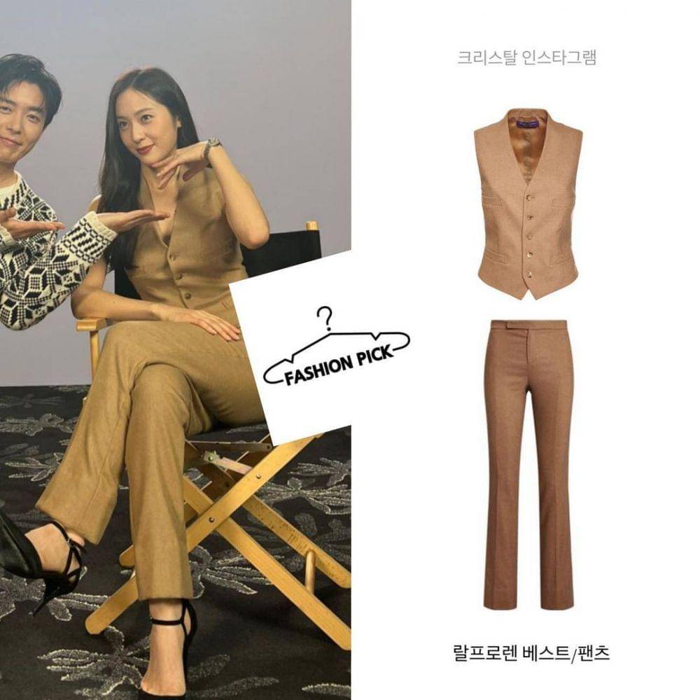 1. Di sesi promosi drama, Krystal memakai blazer tanpa lengan Rp14,2 juta dan celana yang harganya juga Rp14,2 juta merek Ralph Lauren