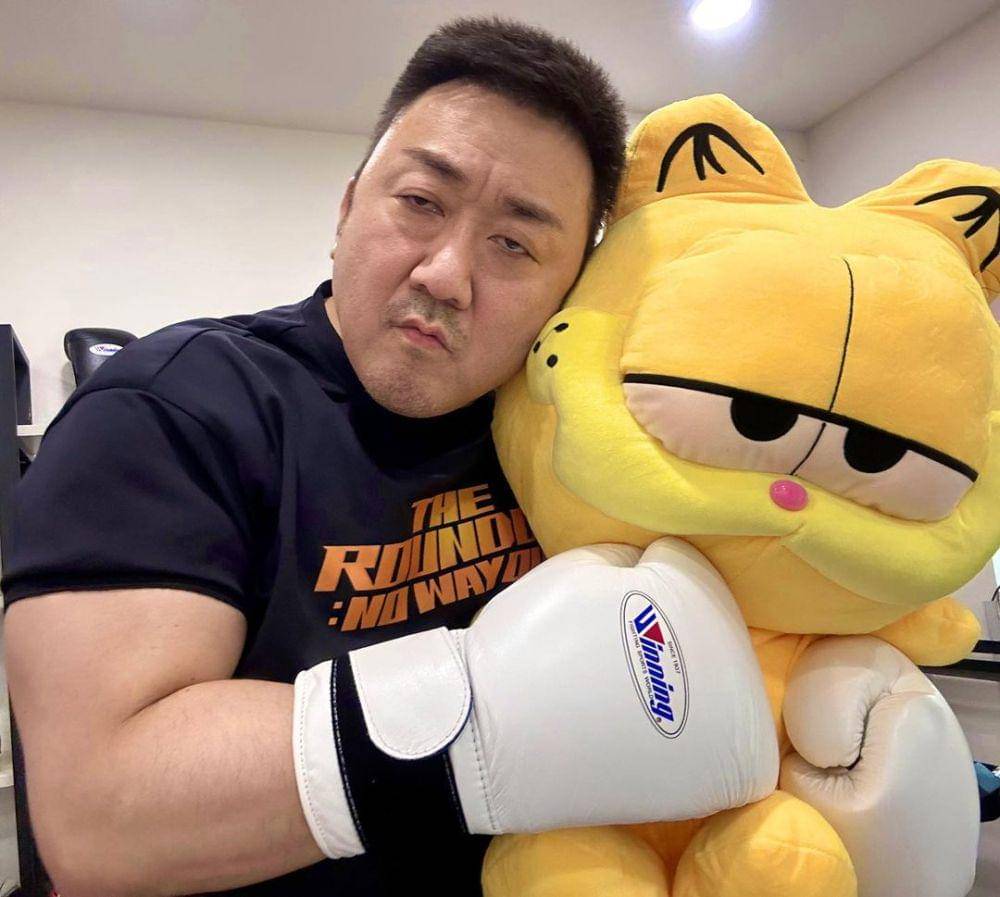 5. Sambil memeluk boneka Garfield berukuran besar, Ma Dong Seok dengan penuh ekspresi meniru ekspresi mengantuk sang boneka