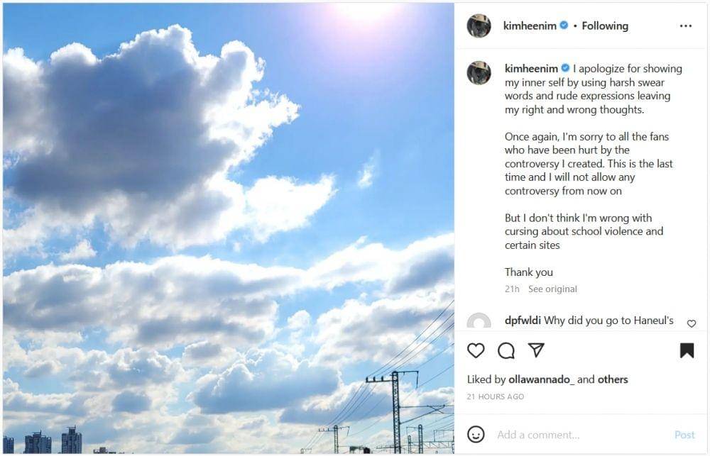 Karena siaran tersebut, Heechul banjir hujatan dari para penggemar. Pada Senin (13/2/2023), ia menuliskan permintaan maaf melalui Instagram @kimheenim, sebagai berikut: