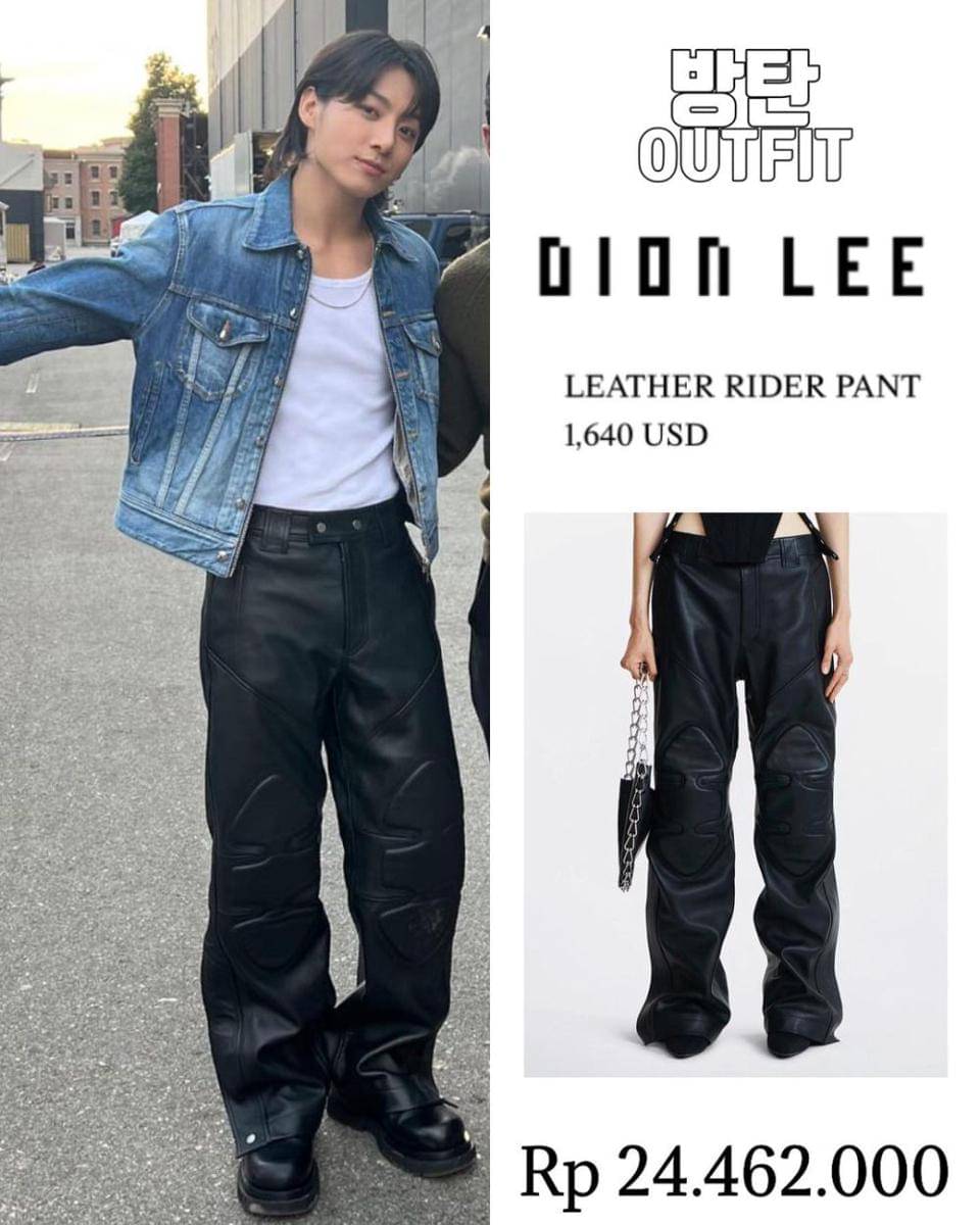 7. Penampilan Jungkook memang cukup simple. Perpaduan white shirt, jaket jeans dan leather rider pant dari Dion Lee ini senilai Rp 24 juta