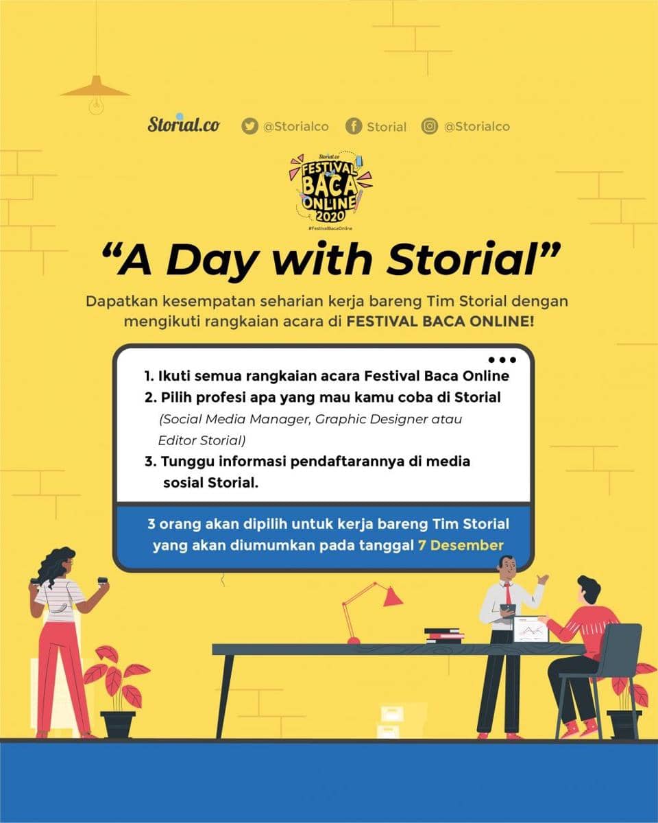 Sebagai penutup dari rangkaian acara Festival Baca Online ini, di penghujung event akan ada A Day With Storial. Di sesi ini peserta bisa mendapatkan kesempatan untuk kerja seharian bareng Tim Storial, dengan syarat telah mengikuti semua rangkaian acara di
