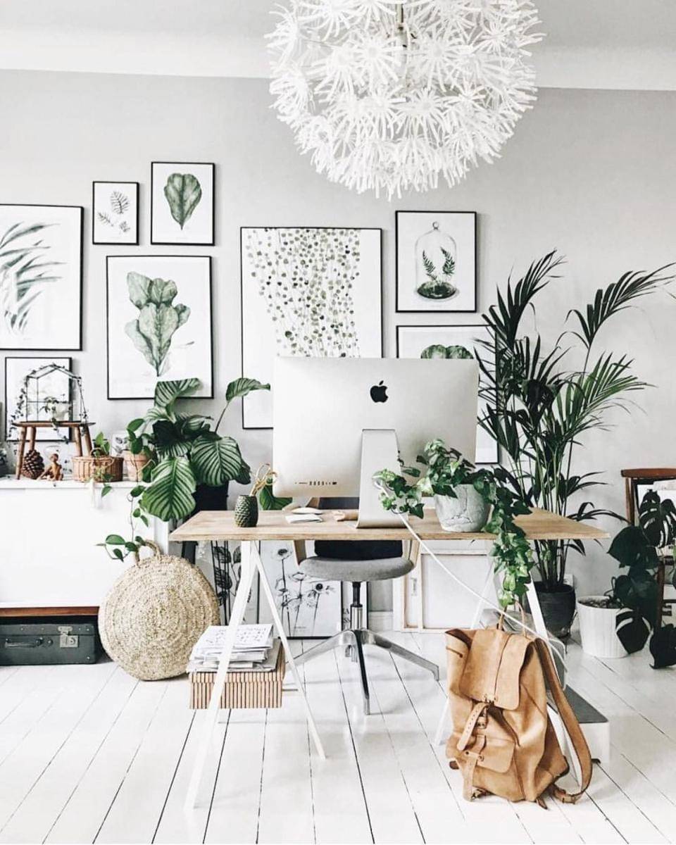 9. Dinding wallpaper tropical, tanaman hias, wall grid, dan lampu gantung bikin ruang kerja kamu jadi instagramable!