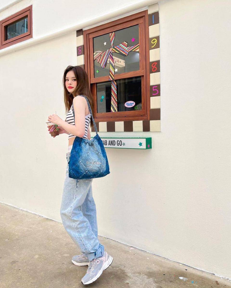 9. Ally tampil casual dengan striped crop top, baggy jeans, dan chunky sneakers yang nyaman, ditambah tote denim untuk kesan playful!