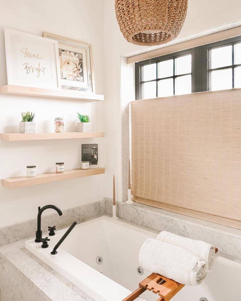 Selain warna cokelat alami, tirai woven wood juga tersedia dalam berbagai warna. Tetap dalam koridor netral seperti warna putih ini.