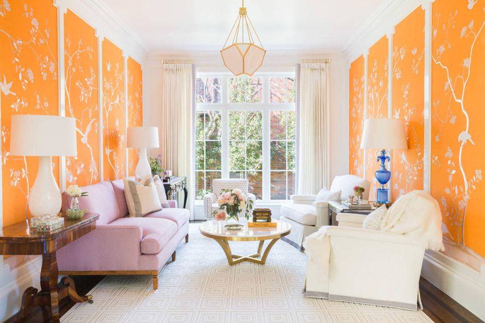 6. Untuk ruang tamu, pilih wallpaper orange motif floral yang memenuhi ruangan. Perpaduan warna putih pada furniture tampak serasi
