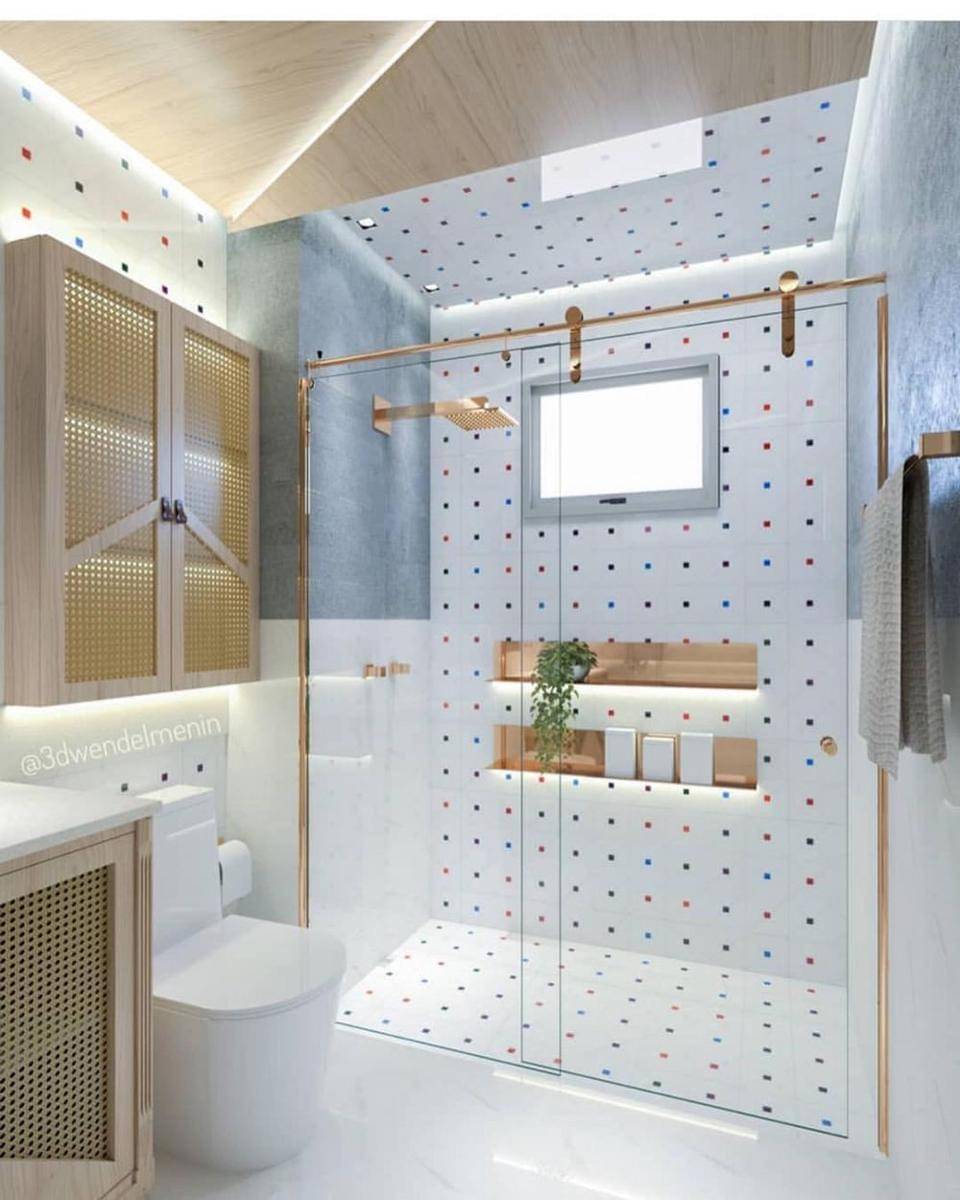 1. Kamar mandi dengan area kering dan basah bisa menggunakan sekat. Padukan warna putih dengan hiasan keramik motif dan aksen kayu