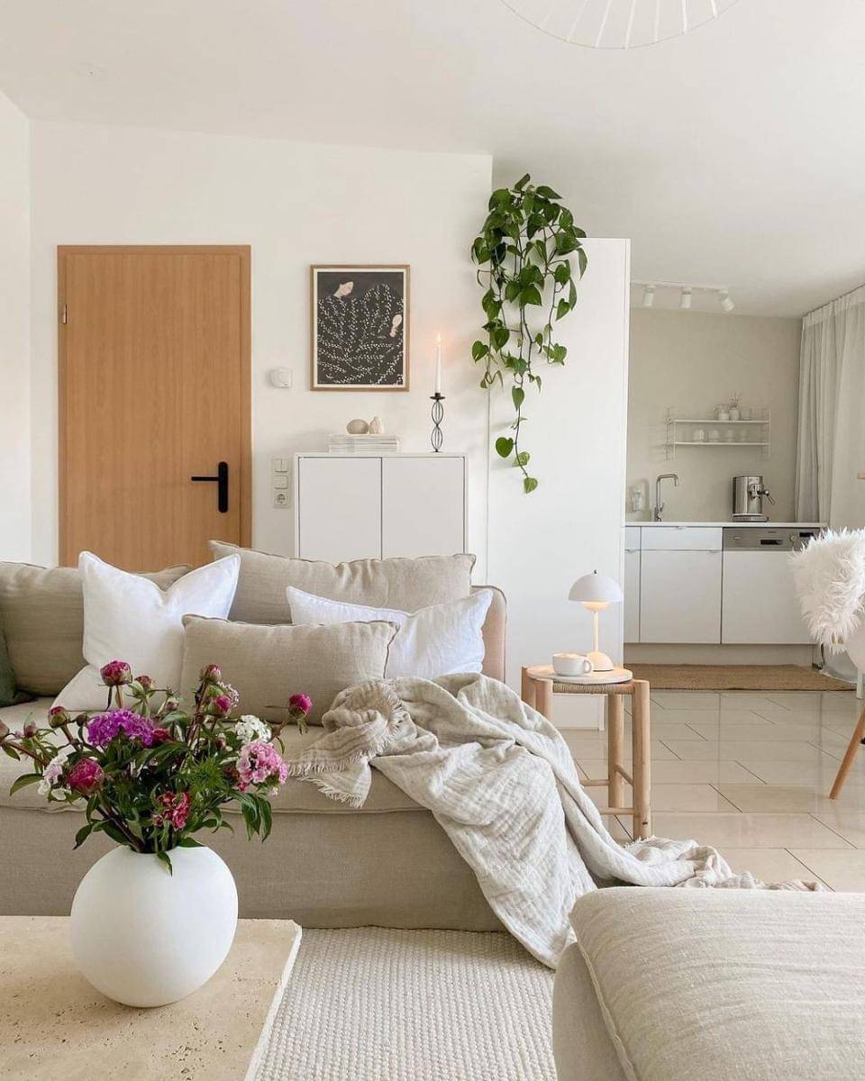 14. Menghadirkan ketenangan dengan sofa L dan meja kayu yang masih mengekspos nuansa alami