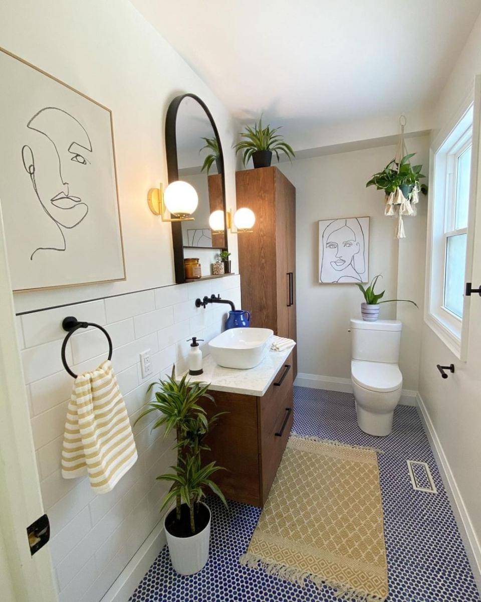 6. Bentuk cermin bisa banget kamu samakan dengan tile lantai. Taruh tanaman segar di atas water closet atau ambalan agar terasa lebih fresh