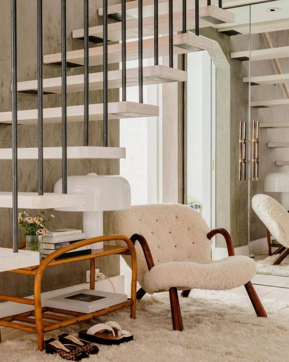 6. Akses ke mezzanine ditopang oleh floating stairs yang elegan. Ruang kosongnya gak mubadzir, diisi lemari penyimpanan dan reading nook