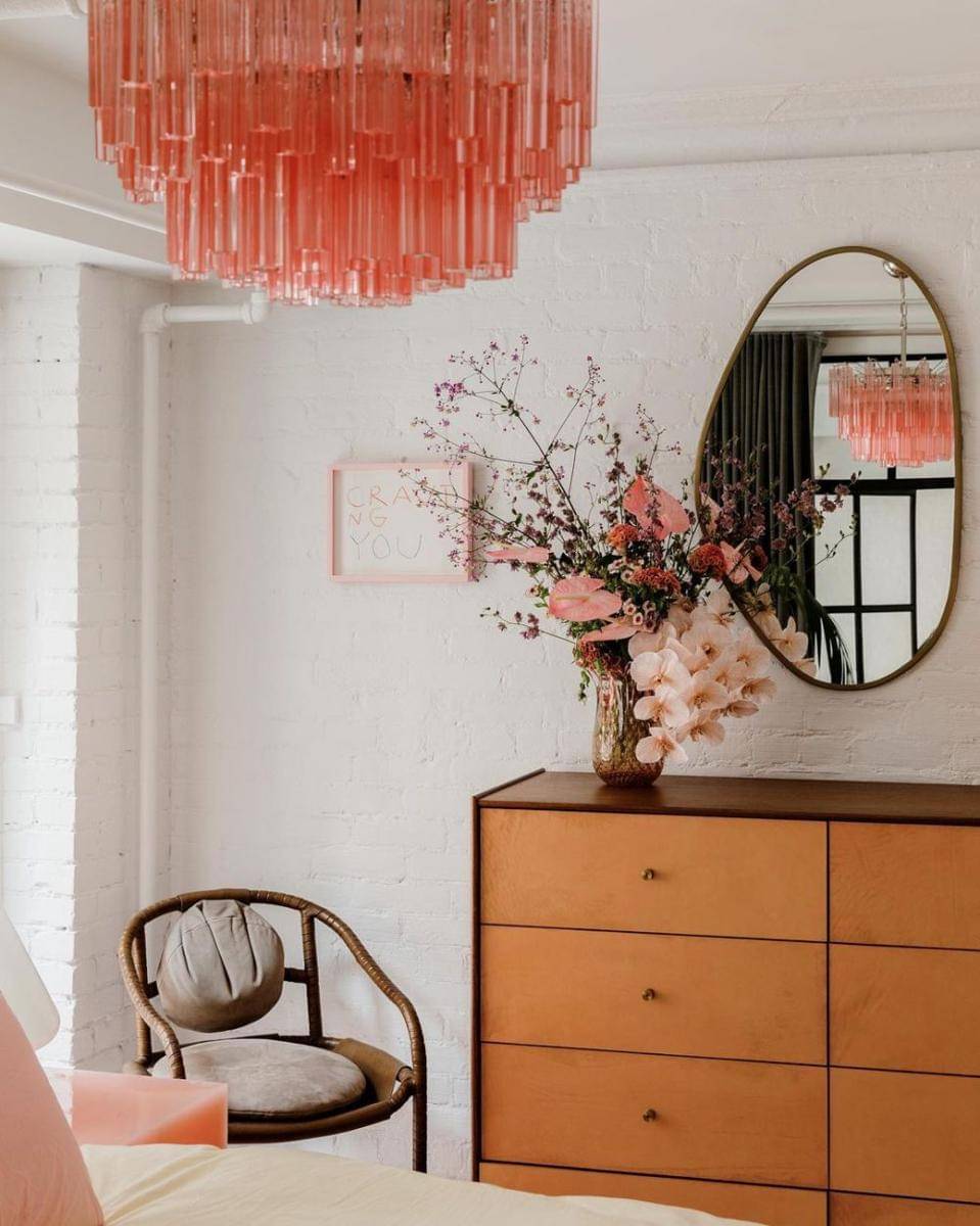 8. Selain meja nakas, warna pink juga tampak pada lampu dan rangkaian bunga. Kamar minimalis, tetapi gak monoton dan hambar