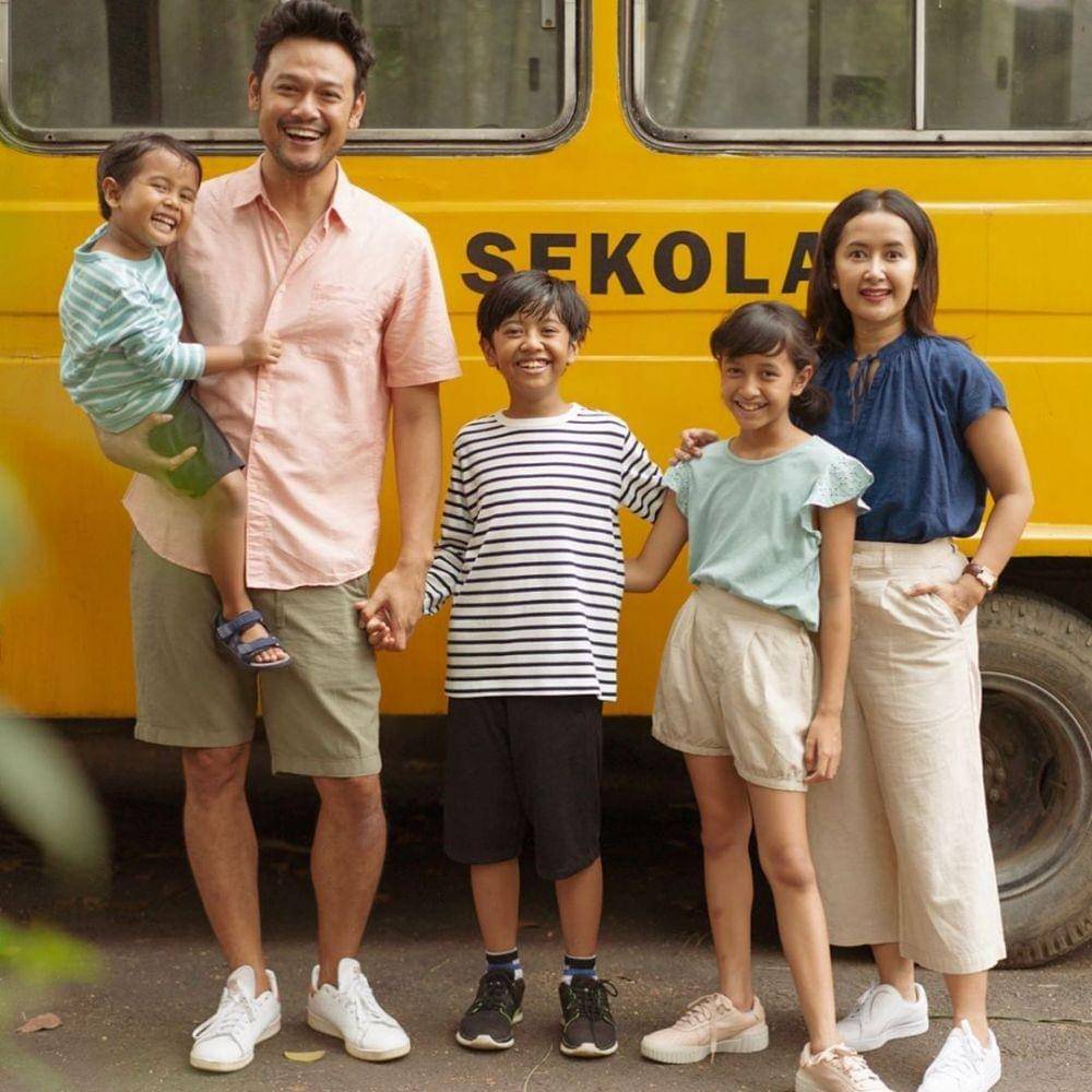 Keluarga ini kompak memadukan sneakers dengan outfit mereka. Dwi dan Denden dengan sweaternya, Dru dengan memakai hoodie, Widuri dan Widi mengenakan jaket. Widi memakai jaket dengan memadukan midi skirt terlihat tetap anggun ya!