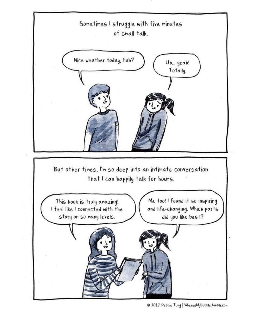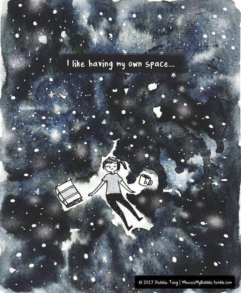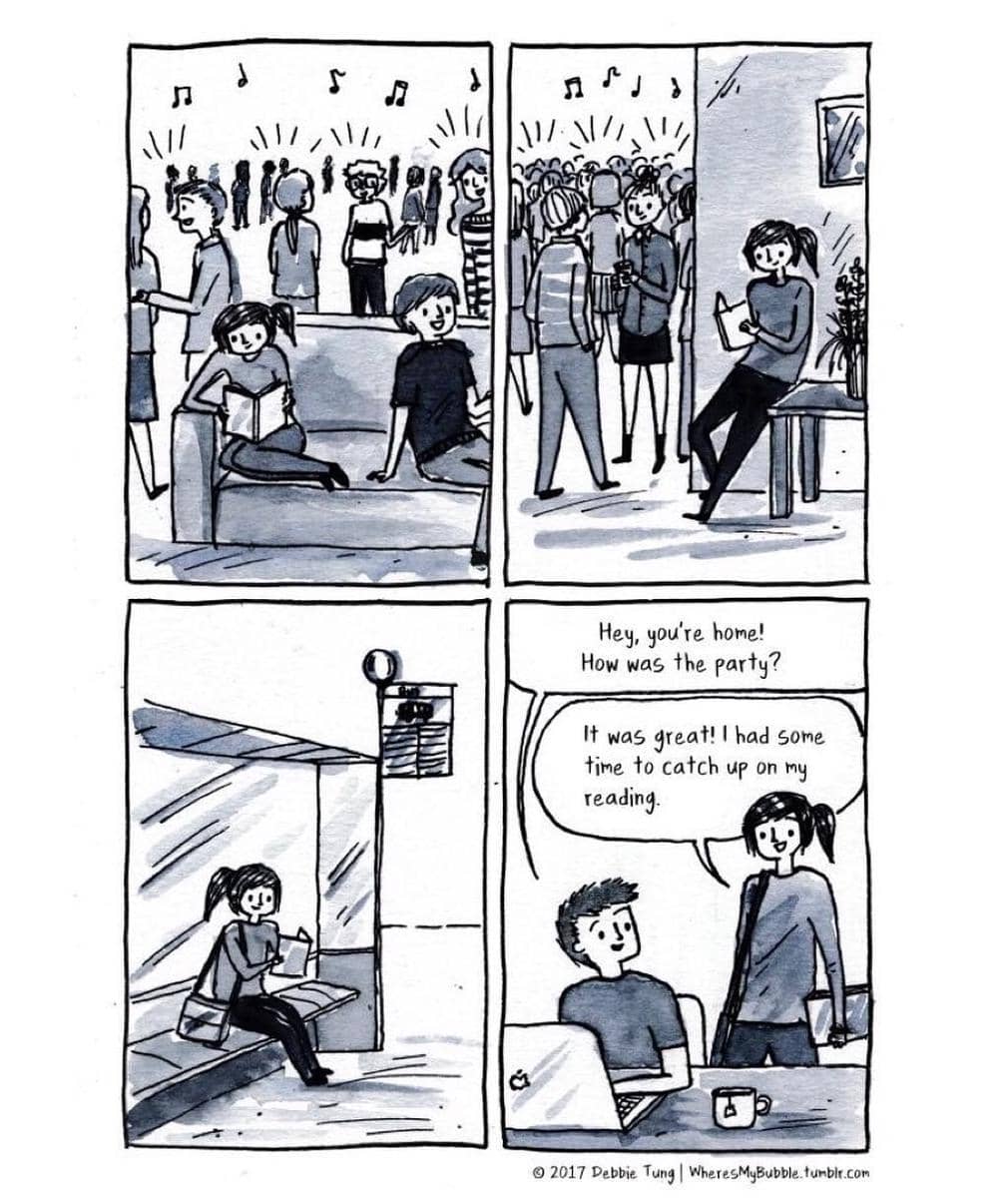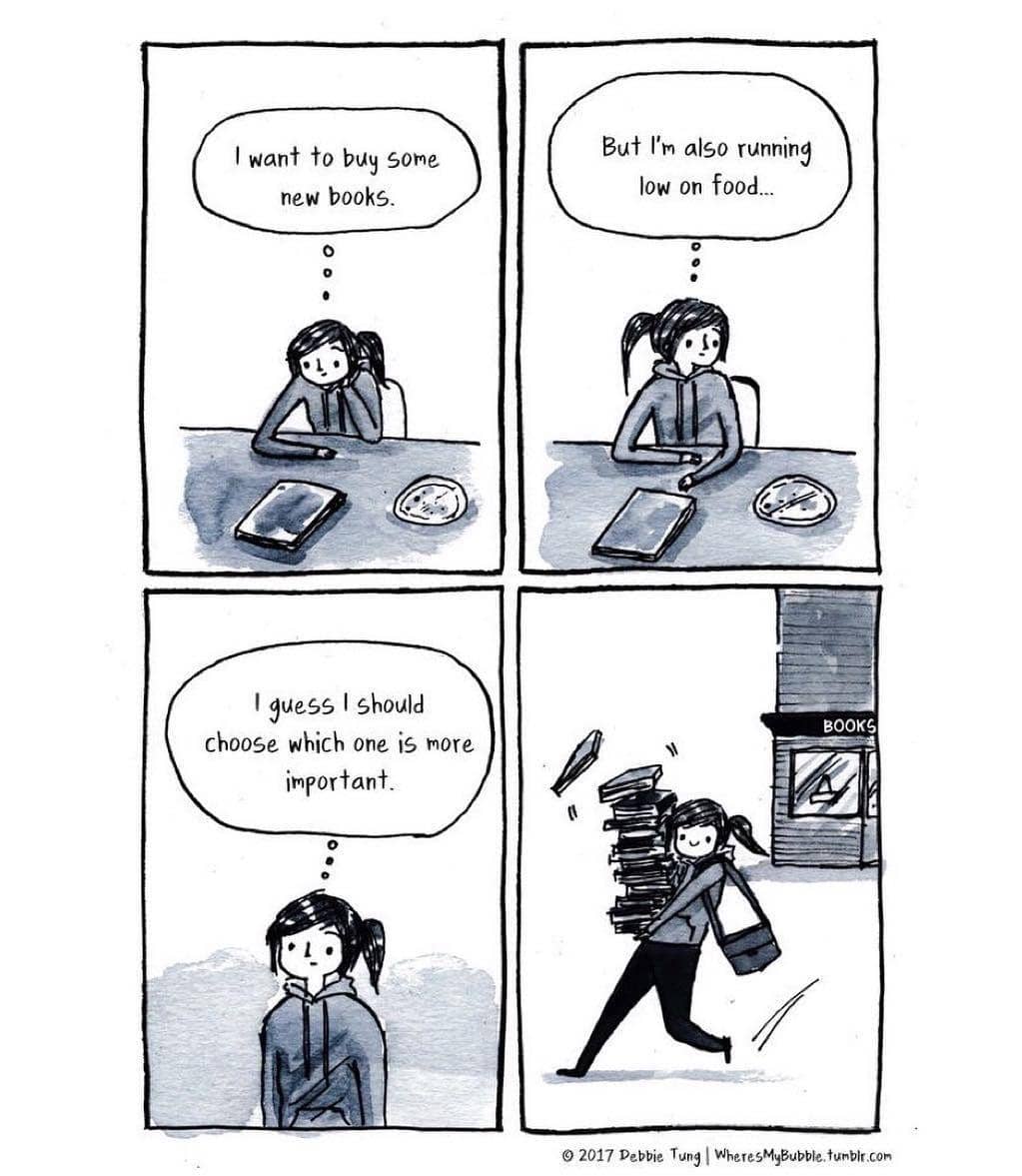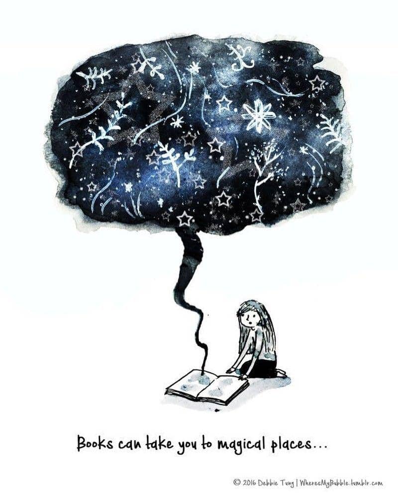 Debbie Tung, seorang kartunis dan ilustrator, menuangkan isi hatinya sebagian seorang bookworm atau kutu buku melalui ilustrasi-ilustrasinya yang diunggah di akun instagram miliknya @wheresmybubble. Lewat ilustrasinya, Debbie menggambarkan bagaimana buku bisa menjadi sumber kebahagiaan yang hakiki bagi dirinya dan juga kamu sebagai seorang kutu buku.