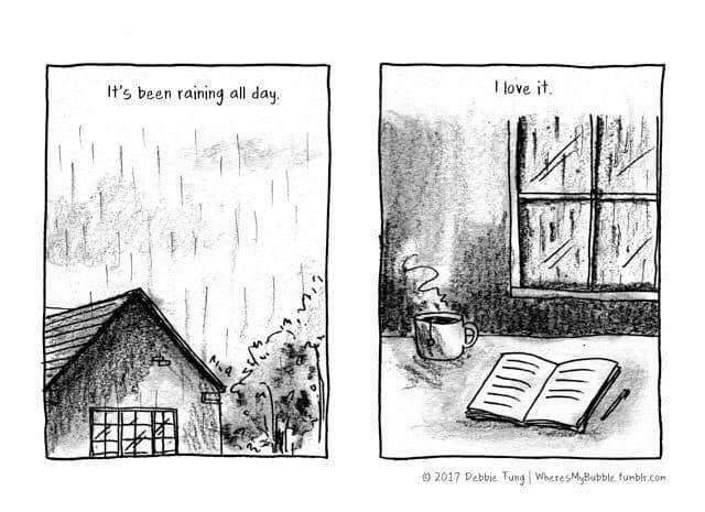 6. Saat yang lain merasa kesal saat hujan turun, kamu malah merasa senang. Berada di dalam rumah berarti lebih banyak waktu untuk membaca buku favoritmu.