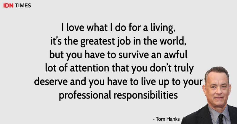 Di bawah ini, ada 10 quotes dari Tom Hanks yang adalah aktor dan pembuat film asal Amerika Serikat. Dalam pekerjaannya, dia dinilai berdedikasi tinggi dalam menciptakan karya yang memukau. Ini dia quotes bijak darinya yang sanggup tularkan kebijaksanaan dalam dirimu.