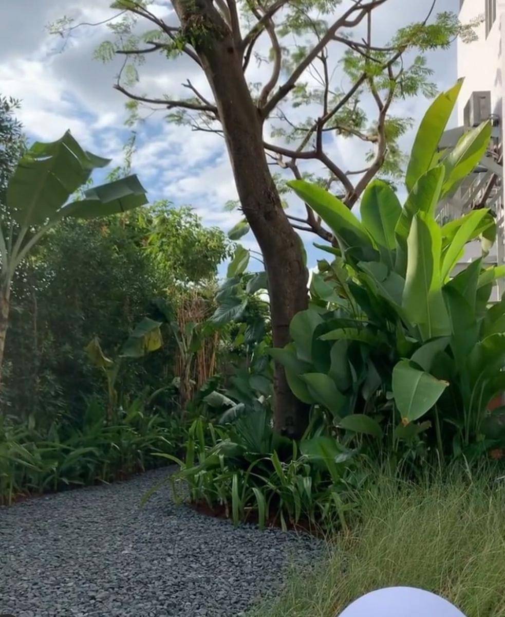 8. Mirip vibe di Bali, berbagai tanaman seperti philodendron, marble, kembang sepatu, dan rumput ekor kuda ditata rapi di taman