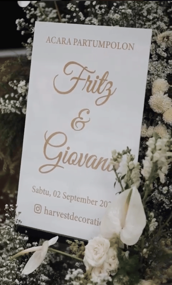 4. Pada detail board sign berwarna putih dan gold, tertulis nama kedua calon mempelai. Bentuknya cukup sederhana berupa persegi panjang