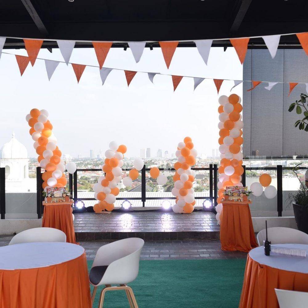 4. Gak cuma balon, hiasan rangkaian bendera di langit-langit pun berwarna oranye dan putih. Beberapa lampu sorot dipasang di tepi deck railing