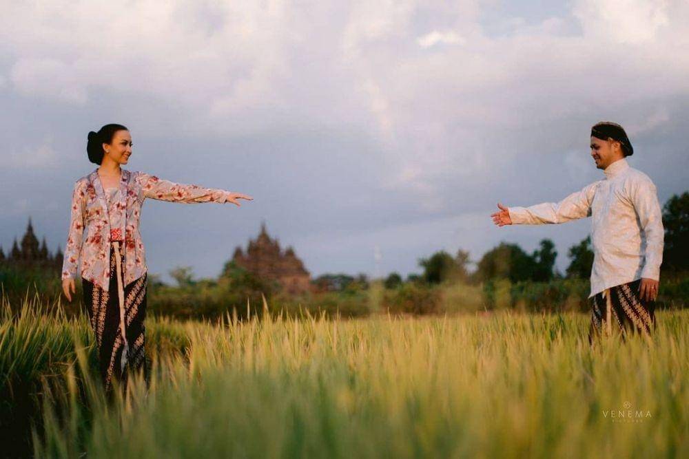 8. Konsep baju adat Jawa minim properti, semakin syahdu diambil di area persawahan berlatar belakang candi
