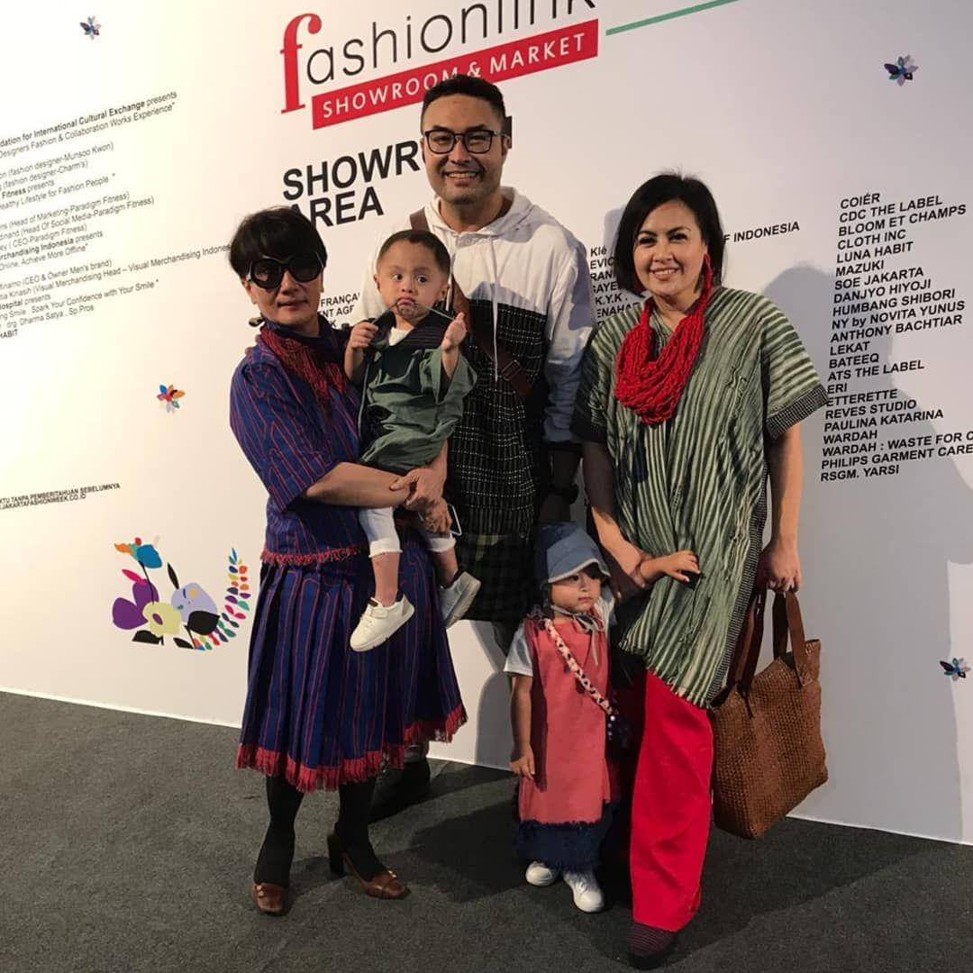 5. Super kompak! Cynthia Lamusu sekeluarga mengenakan motif lurik sebagai atasan hijau yang disambung celana serta statement necklace merah