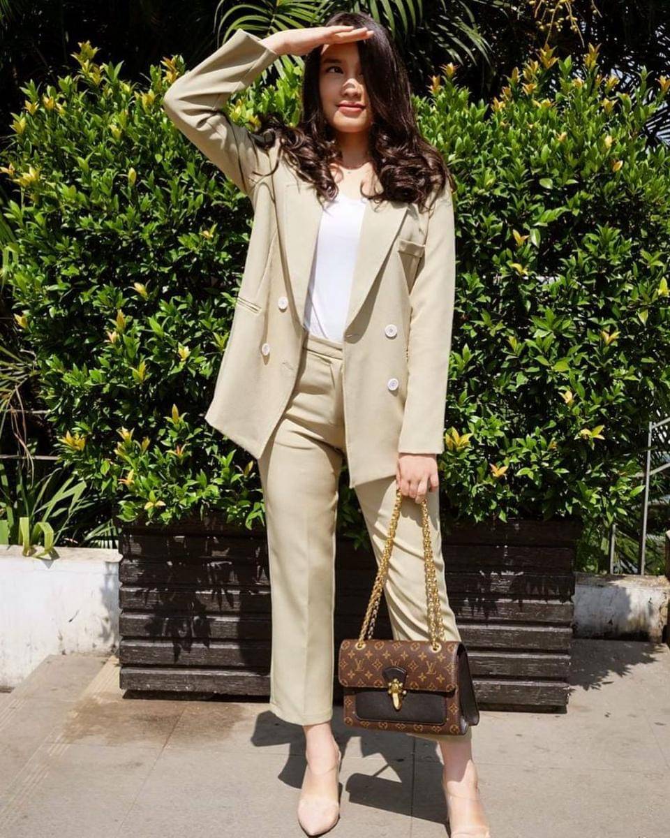 9. Cocok buat ke kantor, kamu bisa tiru gaya Anjani mengenakan suit pants dengan blazer warna senada