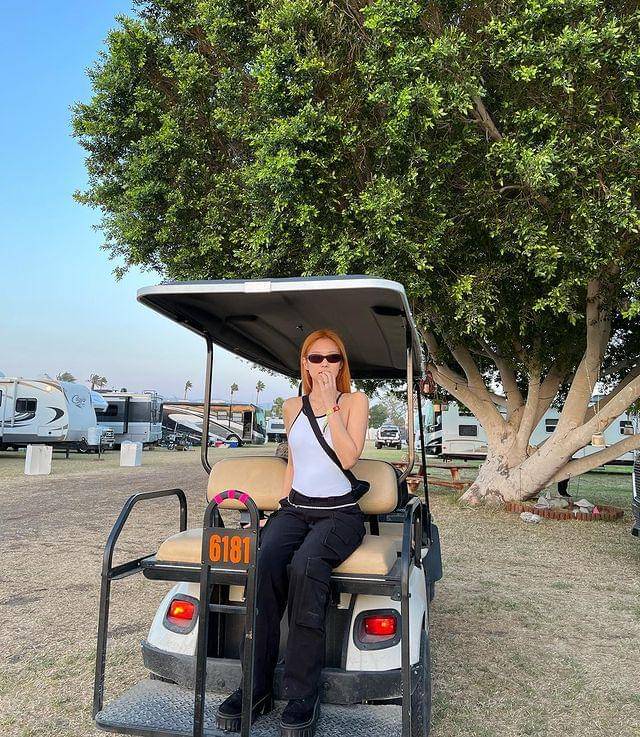 1. Lisa tampil simpel dengan printed crop t-shirt putih dan high waist cargo pants krem. Bucket hat dipilih untuk melengkapi penampilannya