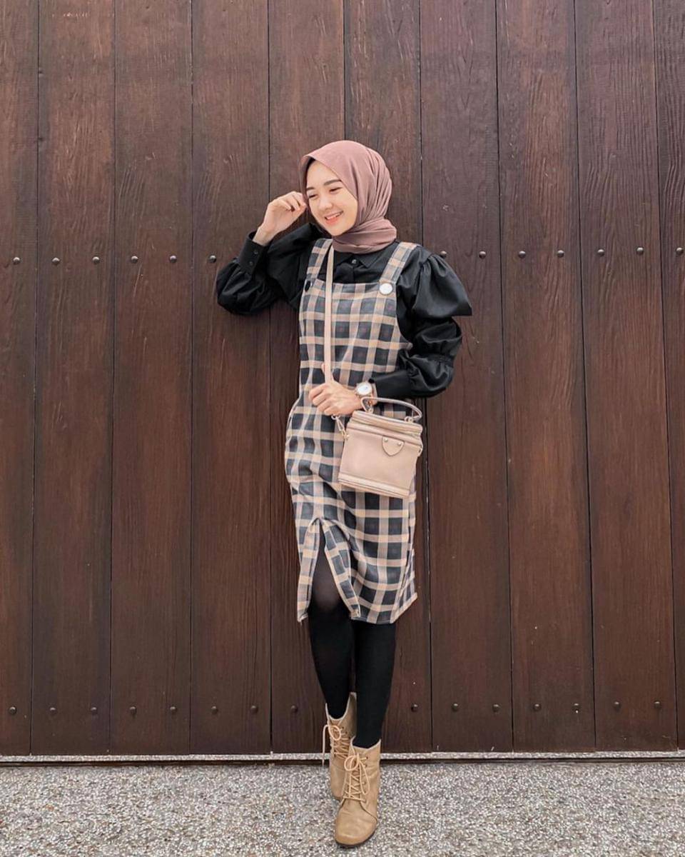 7. Kalau yang ini kombinasi black puff sleeves blouse yang dipadu dengan plaid mini dress tanpa lengan, untuk bawahan Nindi gunakan legging