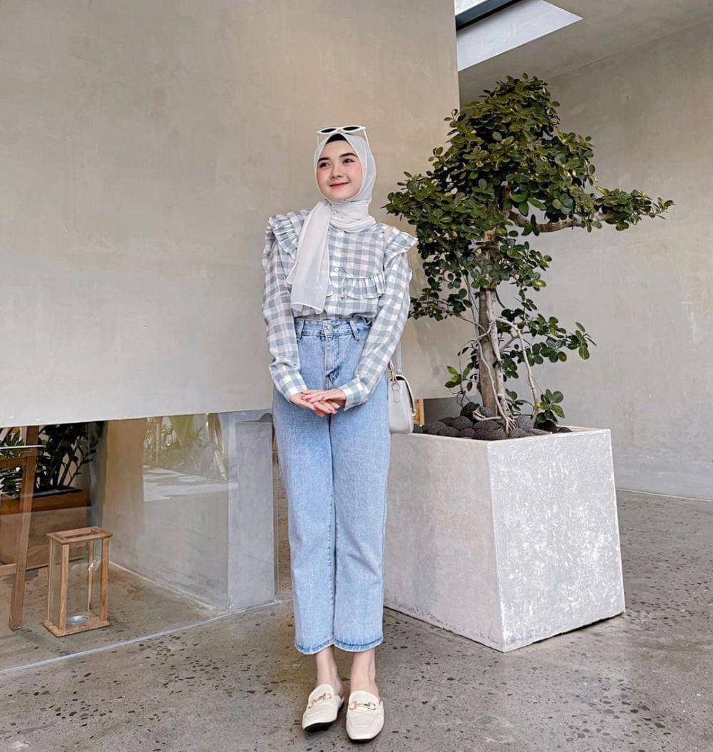 2. Berikutnya ada kombinasi simple yang modis buat hangout yaitu ruffle plaid shirt dan denim pants