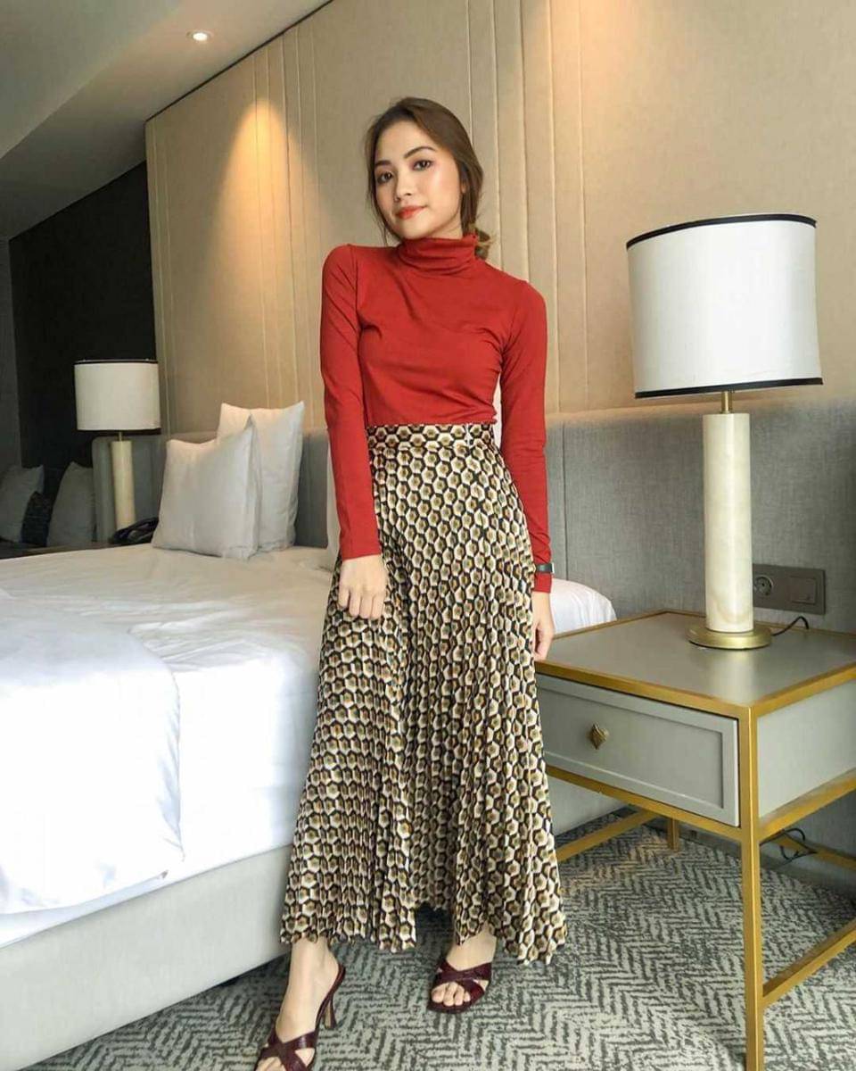 7. Maxi accordion skirt dengan corak penuh seperti ini akan stylish sekali saat dikombinasikan dengan maroon turtleneck