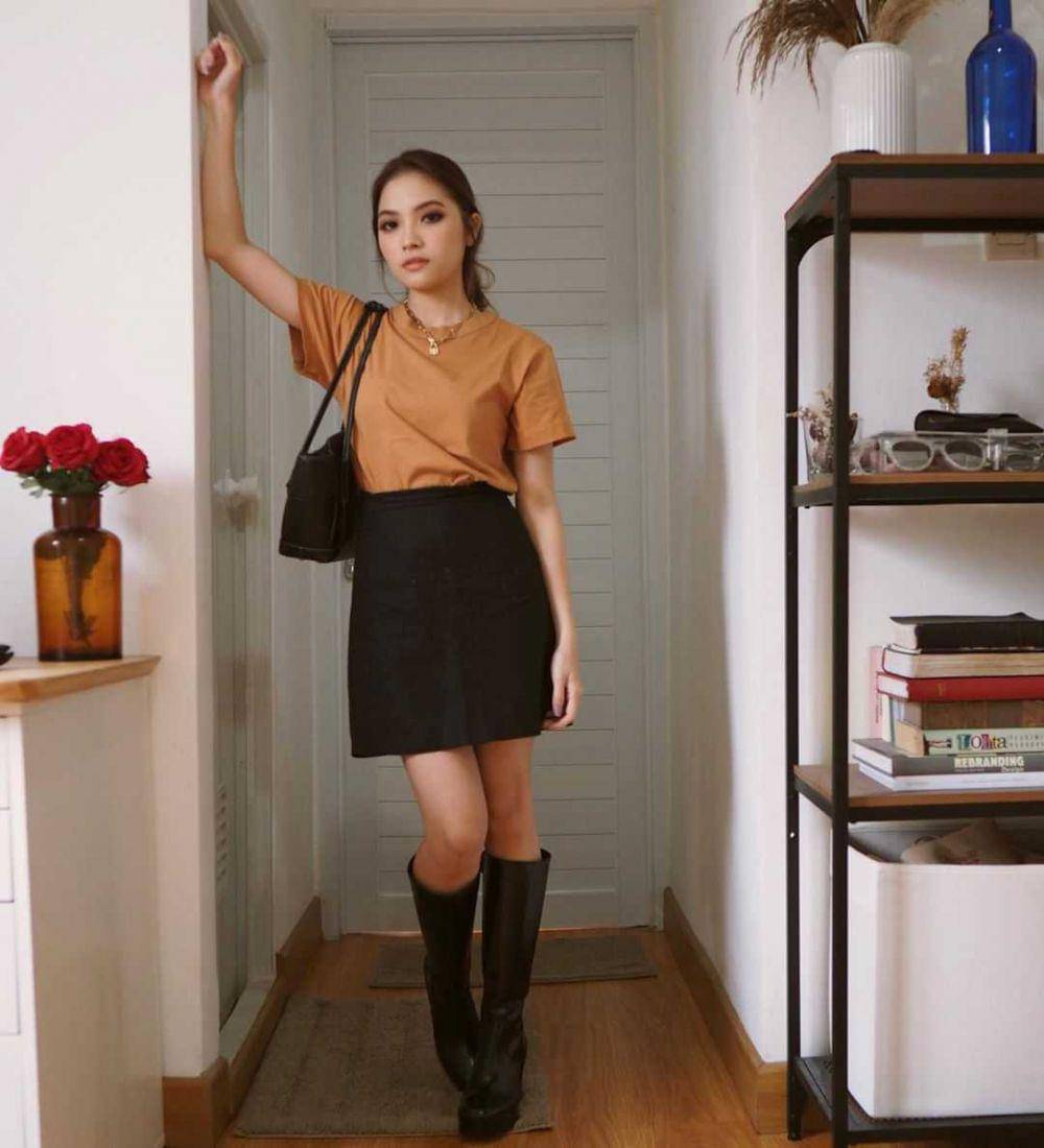 5. Gak pakai ribet dan lama, hanya dengan mengandalkan brown t-shirt dan black mini skirt kamu bisa tampil semodis Stephanie