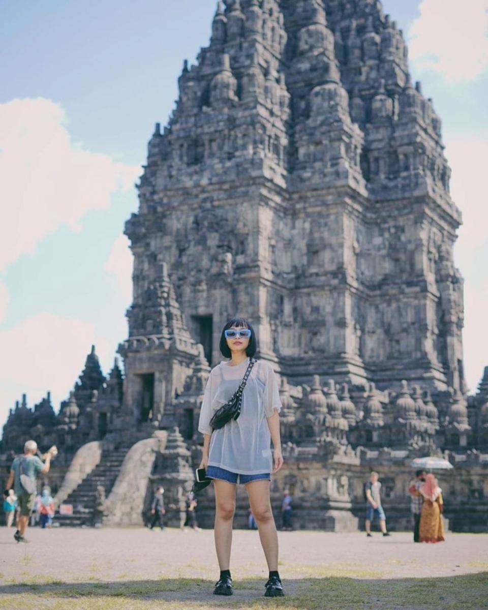 8. Crop top dan hot pants berbalut t-shirt putih terlihat unik pada tampilan Rinni. Sunglasses dan waist bag sebagai aksesoris menjadi spotlightnya