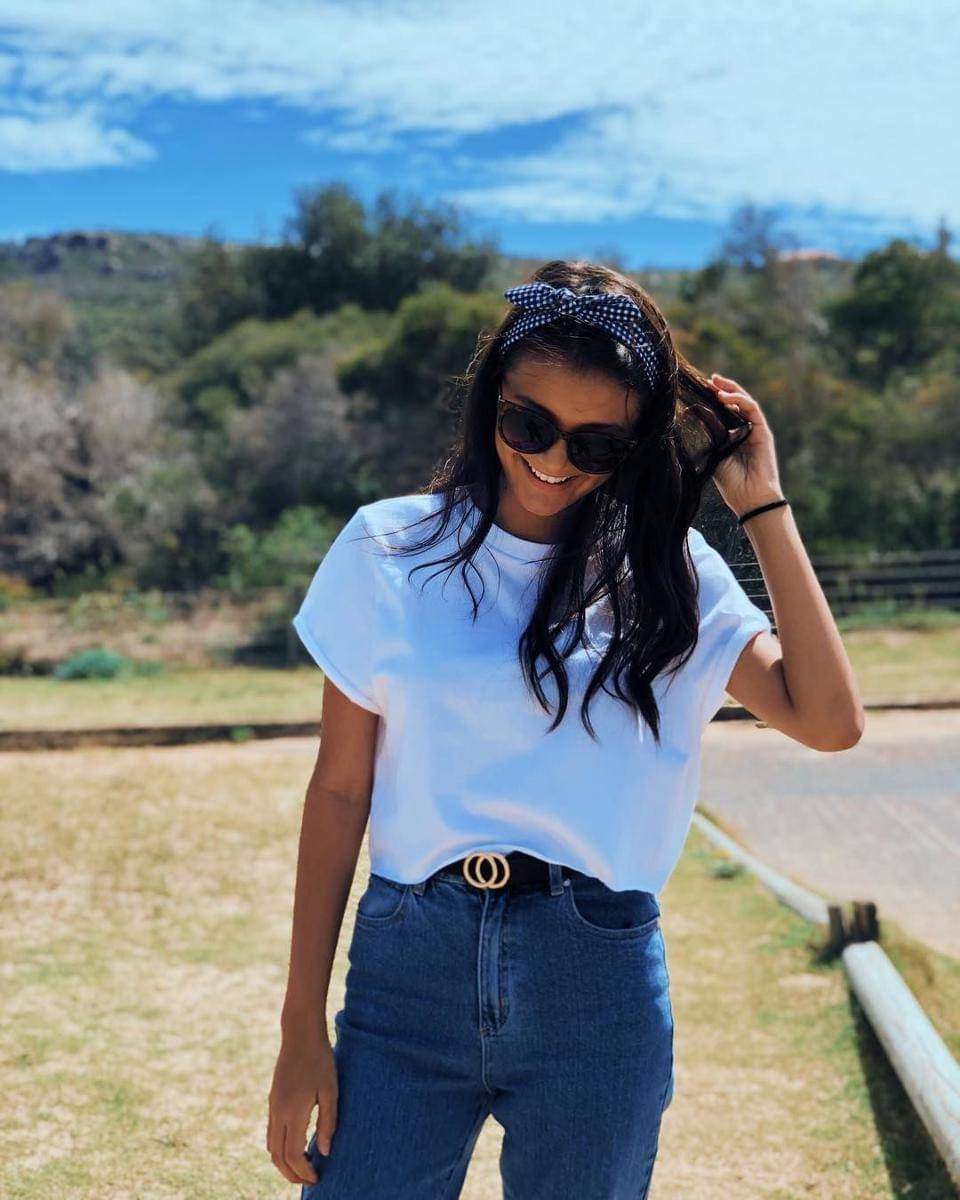 10. Perpaduan antara crop top berwarna putih, jeans dan tambahan aksesori belt, bando, gelang dan kacamata, berhasil membuat penampilan Amanda makin eye catching!