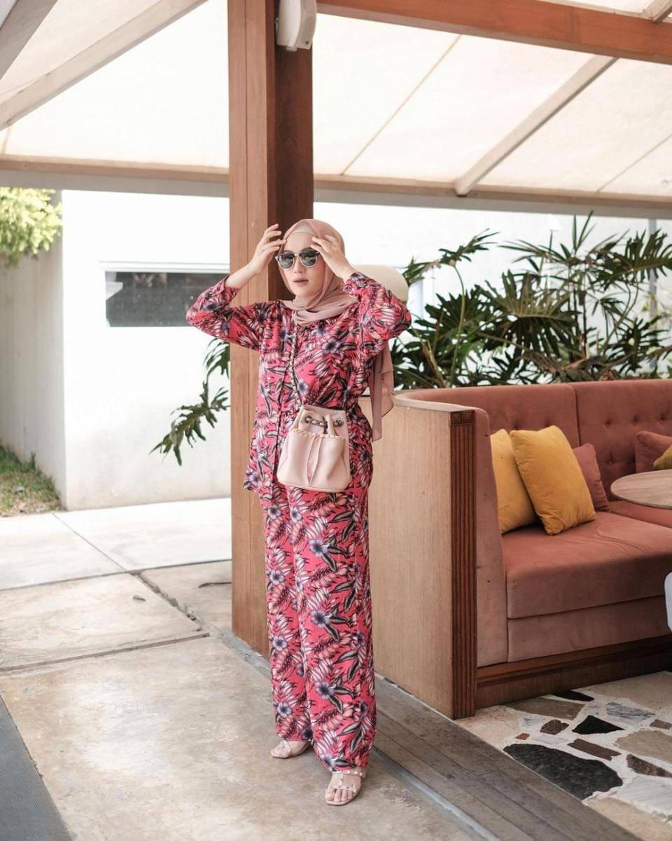 5. Kamu juga bisa tampil kece dengan menggunakan outfit one set bermotif floral serta hijab pashmina warna cream, manis!