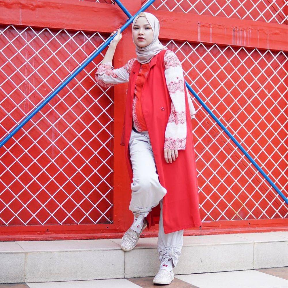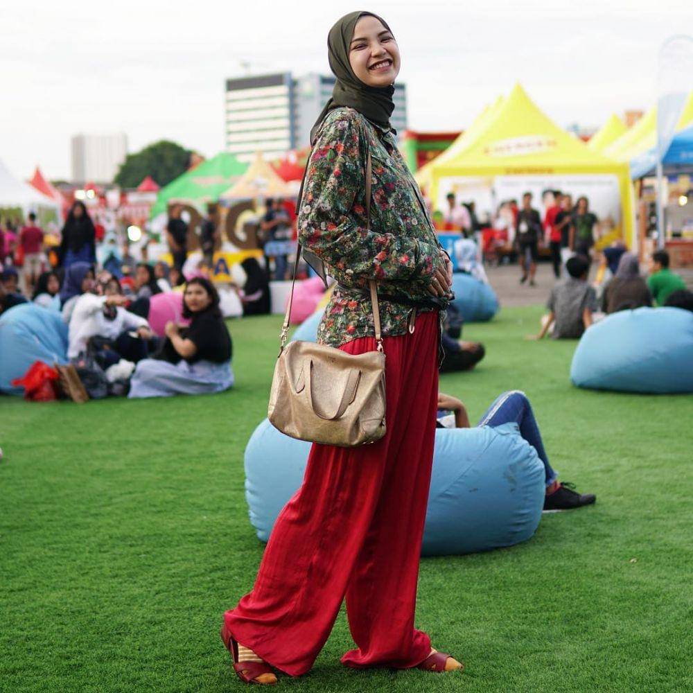 1. Kulot merah dan atasan berwarna hijau army dengan corak bunga bisa menjadi kombinasi yang fresh lho