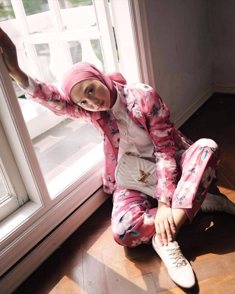 6. Kamu bisa tampil chic dengan outfit one set berupa suit dan celana warna pink bermotif floral, padukan dengan hijab square serta oxford shoes