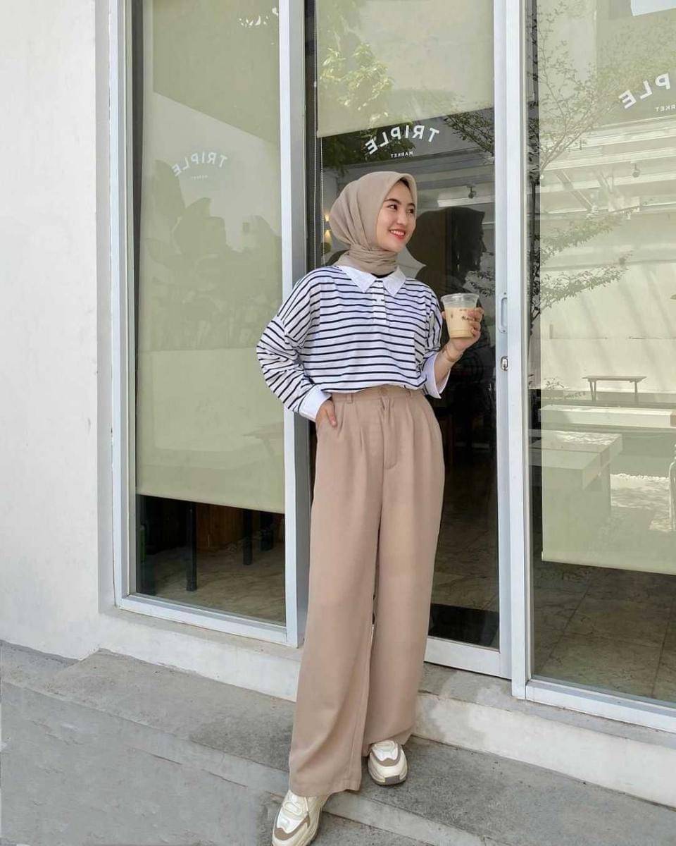 8. Tampil kece dengan haigh waist coksu serta kaos motif salur. Jangan lupa hijab coksu agar makin klop!
